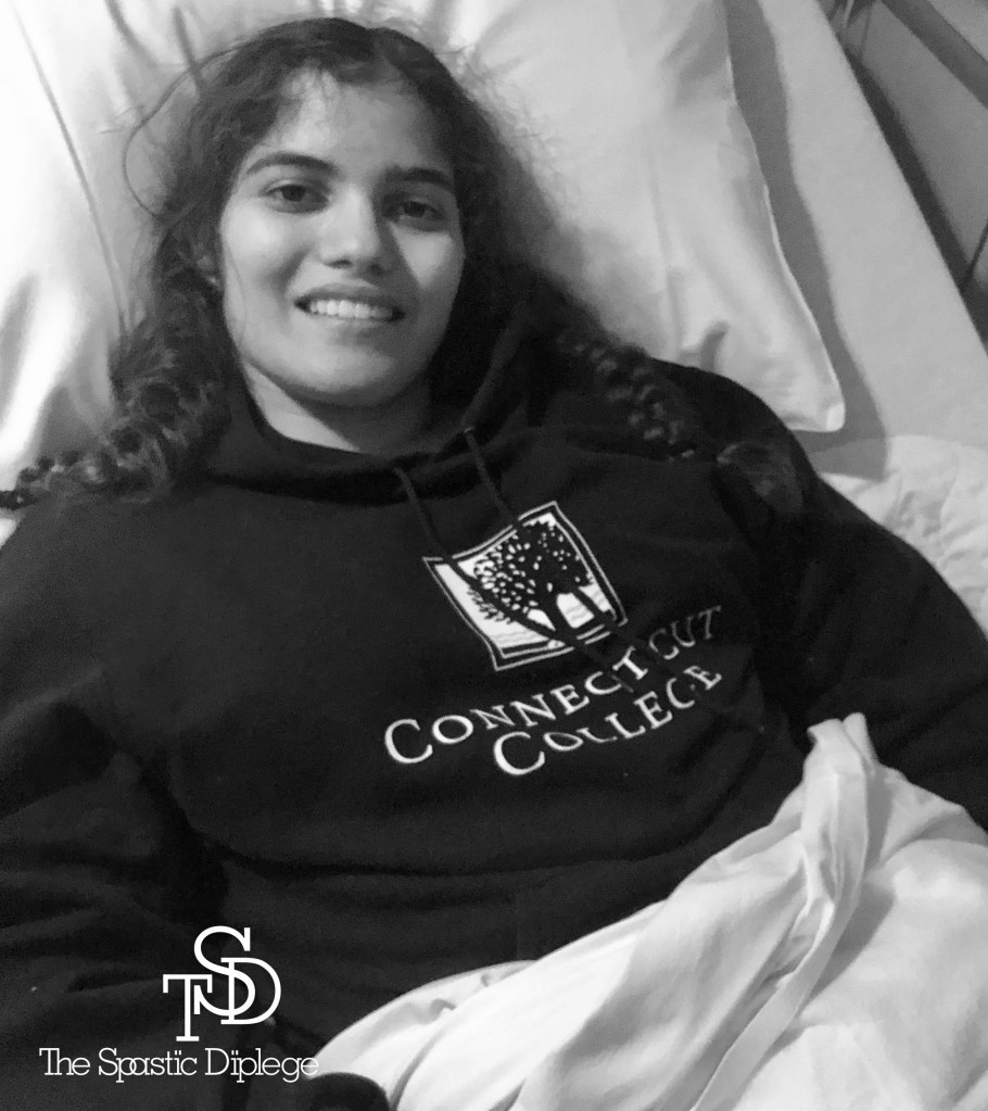 By 9am, my physical therapist, the same one who had done my pre-SDR PT eval, entered the room. When I first met her the day before my surgery, the trust appeared immediately and we got along extremely well. So in other words, I was happy to see her. Luckily, my loved ones were already in the room with me. I say luckily because this was my big moment: after three days of bedrest, it was time to get me out of bed and into my wheelchair. Fortunately, this also meant I could finally get out of that hospital gown and into my own set of comfortable, comforting clothes. “I can wear my own clothes!” I rejoiced.